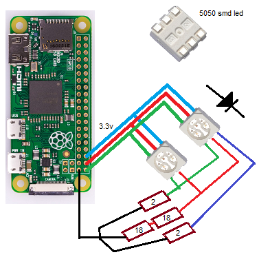 Requiere 2.2v (máximo) para el led rojo y 3.2v para el verde y azul.