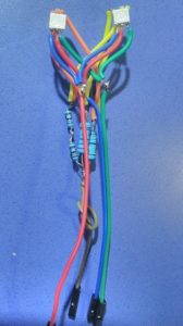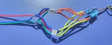 Para ello en el esquema de arriba he usado una resistencia de 2Ω en los leds de color verde y azul, y una de 30Ω (dos de 18 en serie, que es lo que tenía por casa) para el led rojo.