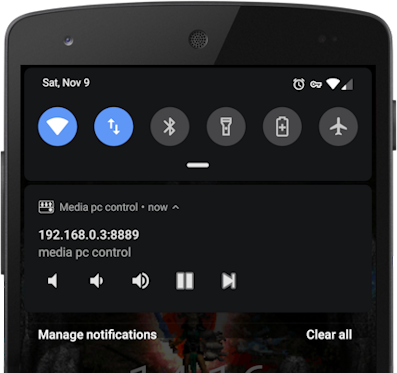 La app nos crea una notificación en el móvil para poder acceder rápida y fácilmente a las opciones de mutear, subir/bajar volumen, play/pause, pasar a la siguiente canción/vídeo del pc.