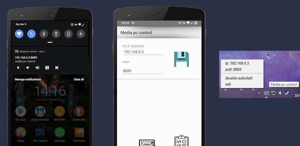 Para usarlo es necesario tener abierta en el PC una aplicación servidor, que nos generará un icono en la barra de estado en la que podremos ver nuestra ip para ponerla en la app y habilitar el autoarranque si lo deseamos.
